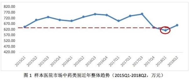 基于PDB国内样本医院市场数据,2018年上半年,中药市场平均销售额(为避免品种变化产生的金额波动,使用总金额/品种数的值作为主要统计指标,下同)创下新低,由于2017Q4出现了近两年间的低值,根据季度趋势,2018Q1成为了近几年的波谷,虽然2018Q2有所回升,但按此趋势发展,2018年全年将较同期出现较为明显的负增长。