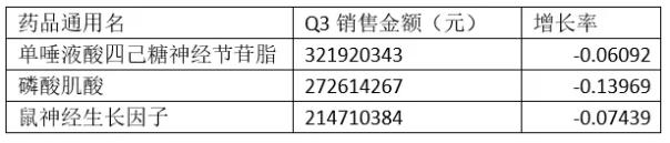 中国医药工业信息中心PDB数据库显示,2018Q3前50大品种中,单唾液酸四己糖神经节苷脂、磷酸肌酸、鼠神经生长因子等临床效果不明显,药物经济学差的品种较Q2继续下滑。