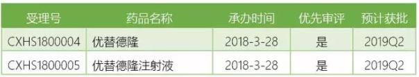 2018年03月28日,CDE承办优替德隆上市申请,纳入优先审评,目前该药物的技术审评完成,预计在2019Q2获批。