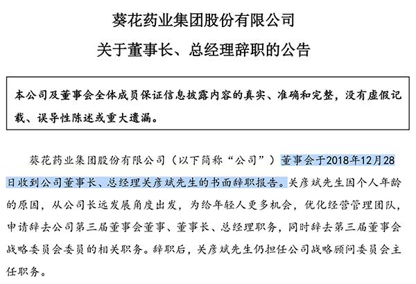 2019年1月1日晚间,葵花药业发布公告,称葵花药业董事会于2018年12月28日收到公司董事长、总经理关彦斌的书面辞职报告,其因个人年龄原因申请辞去董事、董事长、总经理职务,“从公司长远发展角度出发,为给年轻人更多机会,优化经营管理团队”,同时辞去第三届董事会战略委员会委员的相关职务,仅担任公司战略顾问委员会主任职务。公告还显示,关彦斌辞职不会导致公司实际控制人变更,亦不会影响公司经营管理工作正常进行。