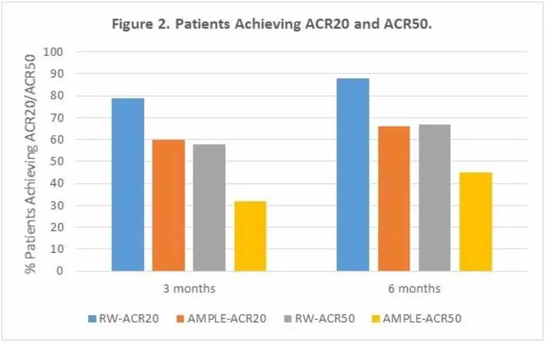 该研究回顾性获取了291 例阿巴西普治疗的RA患者,而且是高滴度抗CCP2抗体患者的临床数据,与此前的AMPLE数据进行比较,结果发现不论是压痛关节数(TJC)、肿胀关节数(SJC)的改善率、ACR20/50比率均与AMPLE研究结果相似。表明阿巴西普在真实世界中治疗RA患者的疗效与临床研究中的结果类似。