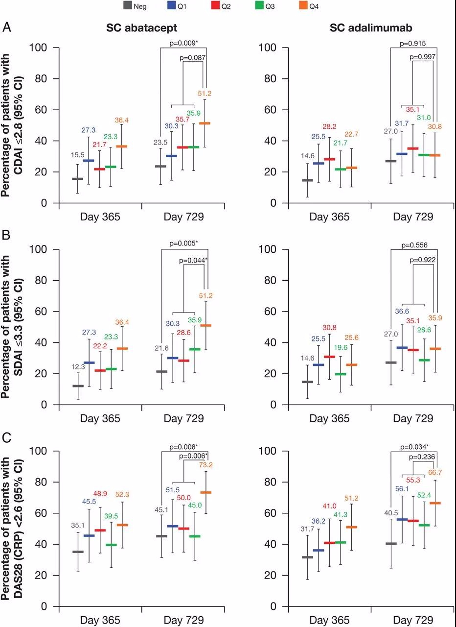 研究者又根据患者的HLA-DRB1基因SE状态对进行亚组分析(-,无SE等位基因; +,≥1SE等位基因)。在SE(+)患者中,阿巴西普的疗效与前类似。
