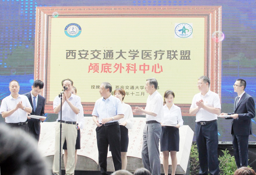 西安通大学颜虹副校长、交大一附院党委书记马辛格、西安交通大学医学部医院管理处韩新生副处长、一附院邹余粮院长助理、朱宏亮教授共同为西安交通大学医疗联盟颅底外科中心揭牌。
