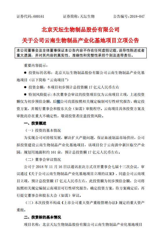 16日,天坛生物公告称为保证血液制品市场供应,公司拟投资17 亿元建云南生物制品产业化基地项目。