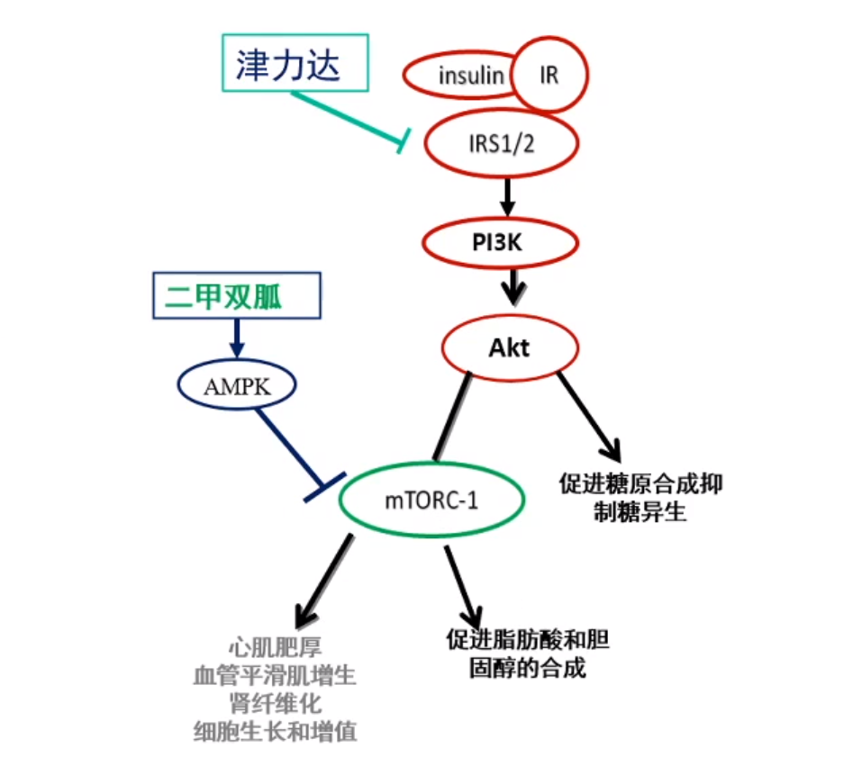 二甲双胍可以激活AMPK通路,抑制mTORC1信号通路,改善能量代谢失衡。徐春教授指出,近年来研究发现,津力达颗粒通过作用于PI3K上游位点,抑制PI3K-Akt-mTOR通路,从而减少糖尿病并发症的发生。从这个角度看,津力达颗粒与二甲双胍有“异曲同工”的作用。