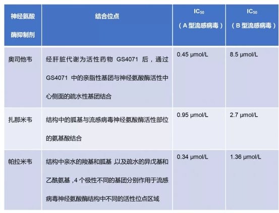 表1.三种神经氨酸酶抑制剂的结合位点与IC50[10-12]