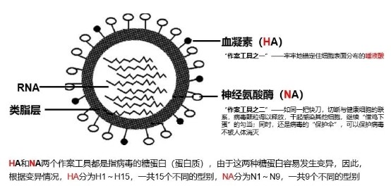 病毒身穿一种叫做「包膜」的衣服,并在衣服上「戳」了许多洞,作为通道让酸性物质——氢离子进入自己体内,营造出酸性环境。流感病毒用来「繁衍」的物质被一层外壳(类脂层)包裹,在酸性环境下,病毒趁势脱去这层「外衣」,释放出毕生精华……[1]